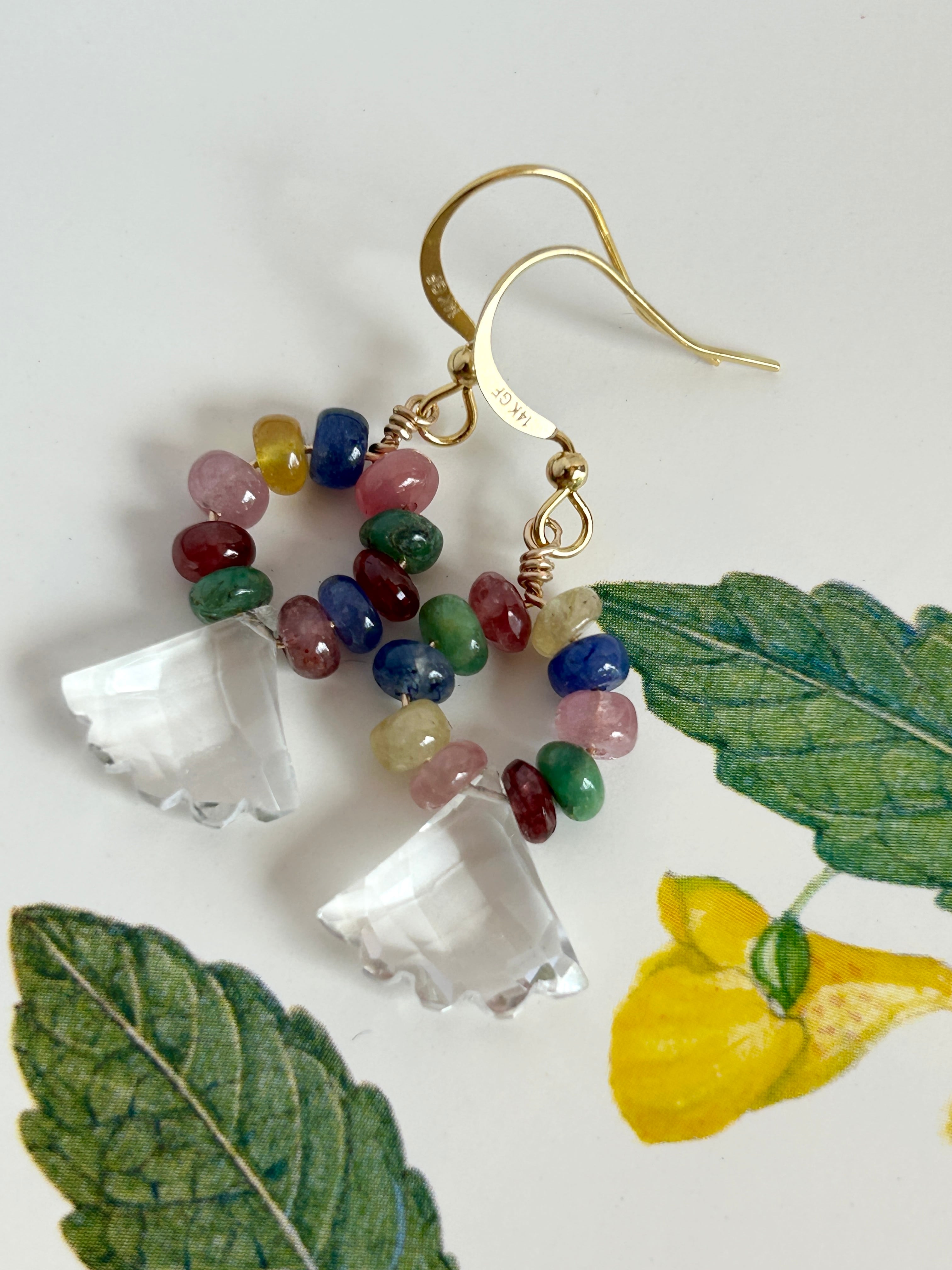 マダガスカル産のブルーサファイア・イエローサファイア・ルビー・エメラルドのカラフルさと珍しいシェイプのクリスタルを組み合わせたピアス・イヤリング。